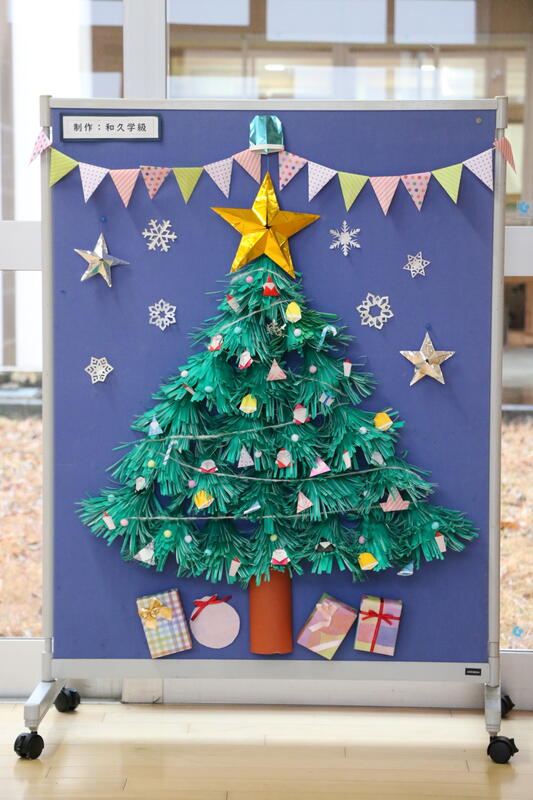 生徒昇降口には、和久学級の生徒たちが作成した「クリスマスツリー」の掲示がされております。