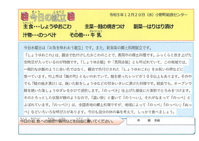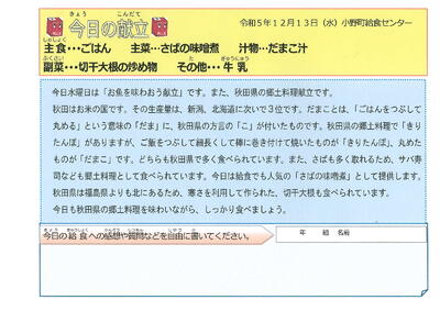 栄養教諭が作成している「今日の献立」には、料理の説明や、料理に関する豆知識などが書かれており、お昼の放送の時に紹介されます。※写真をご覧ください。