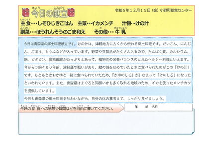 先日(12月6日(水))、給食の郷土料理献立についてご紹介しましたが、今月は4つの道県の郷土料理が提供されました。