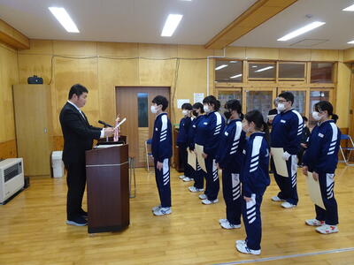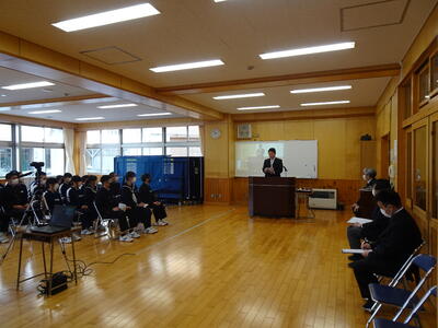 1年生は「冬休み中、寒さに負けたい体力づくりを達成できたこと、今年は自分自身の力で全国大会の切符をつかむこと、そしてこれから入学してくる後輩たちに憧れられる存在になこと」について、2年生は「昨年はけがに苦しんだのでしっかり体力づくりをすること、そして続けてきた野球を頑張り、強豪校に進学すること、学習と運動を両立させること」について、3年生は「みんなで協力して良い思い出がたくさんできた2学期だったので、みんなで高校受験も乗り越えること、そして全てを全力で頑張り、悔いの残らない中学校生活にすること」について発表しました。