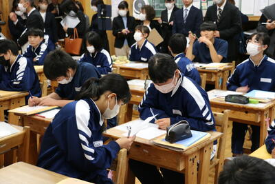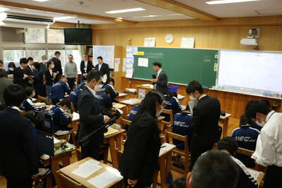 参加した先生方には、生徒たちが話し合いながら問題を解決したり、ICTを活用して説明したりするなど、意欲的に学習に取り組む姿をたくさん見ていただくことができました。学力調査官にもたくさん褒めていただきました。