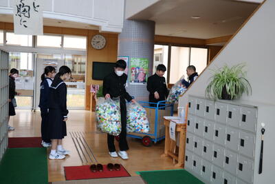 ボランティア委員会の皆さんが昇降口まで運ぶのも一苦労でした。