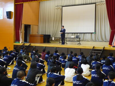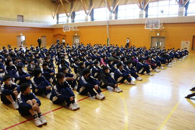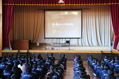 その後、体育館に移動し、校長の講評と、防災担当の先生からのお話、防災動画の視聴を行いました。