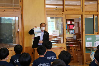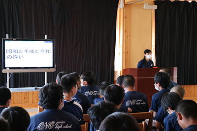 説明の後には、小野町議会議員の会田明生様から「一般質問について」の講話をいただきました。講話の中で「町民がよりよく生活するため、質問を考えています。議会での質問の後に実現したこともあります。」とのお話をいただき、生徒たちも真剣は表情で講話を聞いていました。