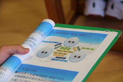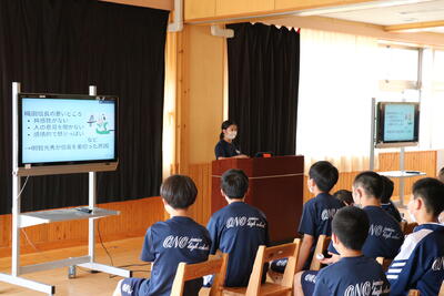 本日は、中学生議会に先立ち、町役場から総務課と企画政策課の担当者から、それぞれ「中学生議会の開催目的及び町の役割について」と「小野町総合計画の概要について」の説明がありました。