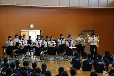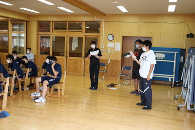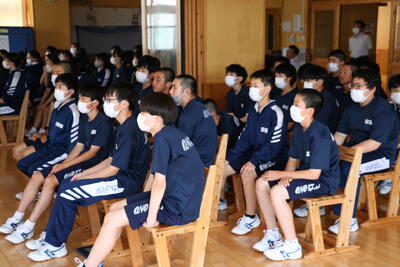 7月3日(月)6時間目に、県中体連陸上競技大会に出場する3年生3名と、大会を間近に控えた吹奏楽部の激励会が行われました。