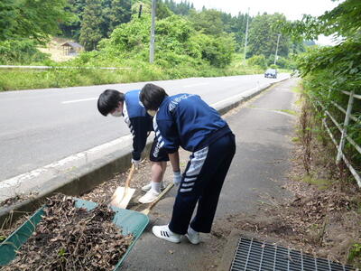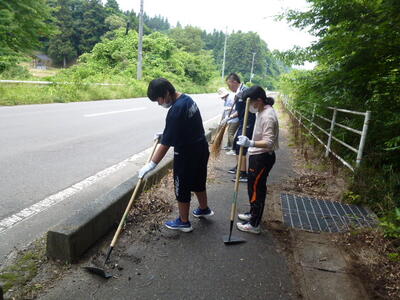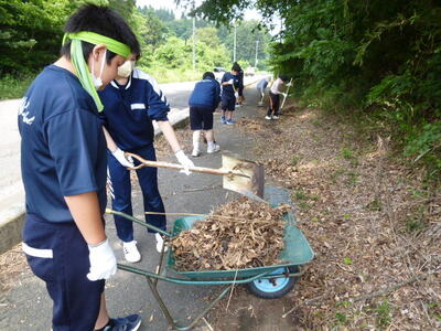 雨は降っていませんでしたが、梅雨空で蒸し暑さを感じる中、スコップや竹ぼうき、一輪車などを使って、5人で協力しながら作業を行いました。