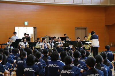 その後は、吹奏楽部による大会発表曲の生演奏がありました。力強い演奏の中にも全体のバランスもよく、聴いている人たちの心を引きつける素晴らしい演奏でした。部長からは、日頃の練習を工夫しながら行ってきたという説明があり、その成果がきちんと表れていたと感じました。