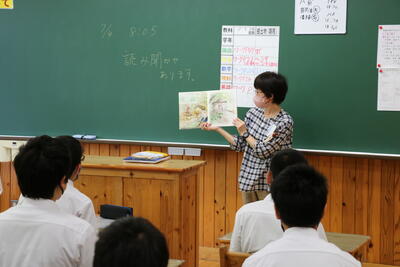 今日も朝から、町の「ふるさと文化の館」の職員さんにお越しいただき、和久学級と杉の木学級の生徒たちに読み聞かせを行っていただきました。