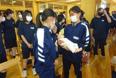 途中、新生児人形の抱っこや心音聴取の体験も行いました。新生児人形を優しい笑顔を浮かべてそっと抱っこしている生徒の姿を見て、ほっこりした気持ちになりました。