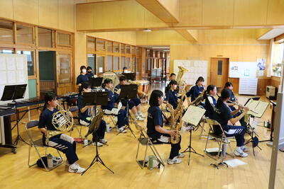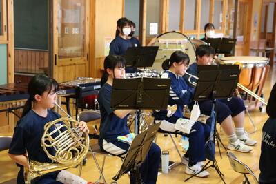2、3年生の各パートが集まっての合奏練習では、お互いに指示を出し合いながら、真剣な表情で練習に取り組んでいます。
