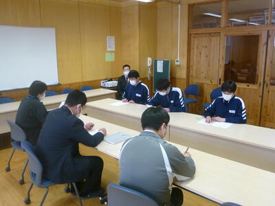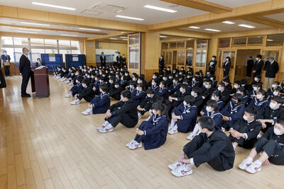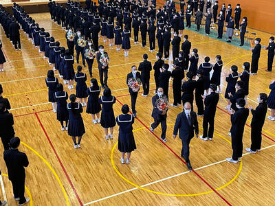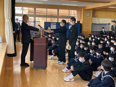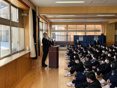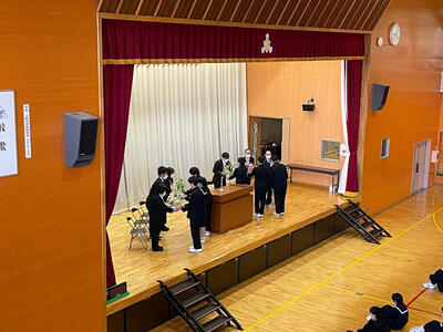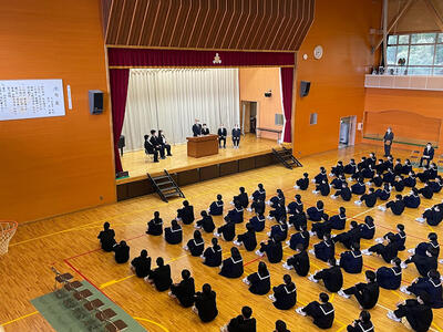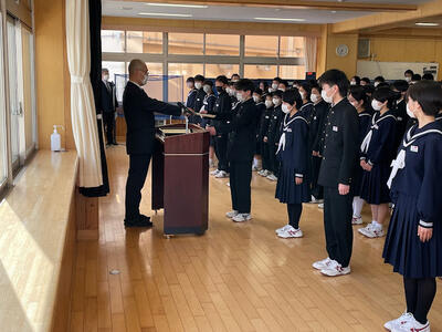 本日3月23日8:35より、令和3年度修了式を行いました。最低気温が-10℃近くで、コロナ対策もあり多目的室にて時間を短縮して行いました。1,2学年代表へそれぞれ修了証を授与し、校長から自立に向けた大人としての行動を期待するという内容の式辞がありました。また、県の書き初め準大賞に輝いた生徒2名に表彰状を授与しました。