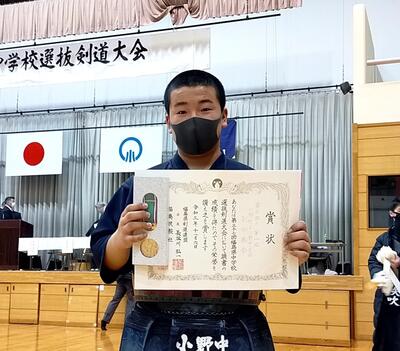 11月6日、小野町民体育館で開催された県選抜剣道大会の男子個人戦に出場した2年生が見事、優勝しました。