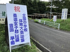 福島県中体連柔道競技大会、女子個人戦40kg級で優勝した3年吉田さんは、8月17日から広島県で開催される全国大会に会出場します。町教育委員会では、町内に「祝 全国中学校体育大会出場」の看板を設置してくださいました。本当にありがとうございます。子ども達の励みになります。