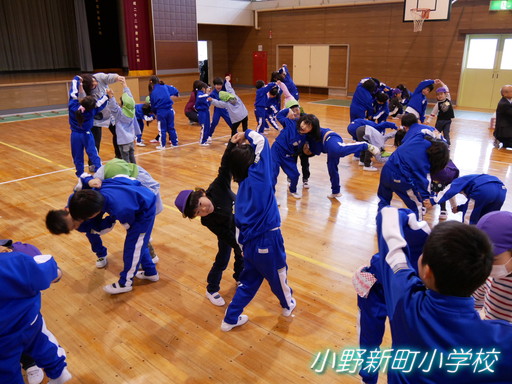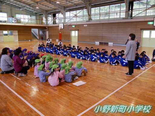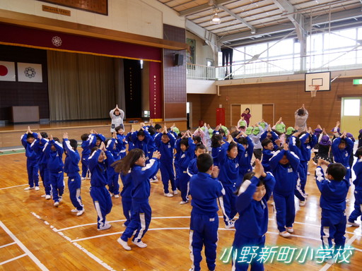 2018年4月27日 19時28分小野新町小学校の1年生の児童と、小野わかば幼稚園と、中央さくら保育園の園児たちとの交流会が行われました。1年生によるあいさつの後、「ちょっとだけ体操」「じしゃくのパワー」のダンスを元気いっぱいに踊りました。すぐに振り付けを覚え、リズムにのって踊る姿が見られました。「もうじゅうがりに行こうよ」のゲームでは、たくさんのお友達とグループを作りながらゲームをすることができ、とても楽しい交流会となりました。