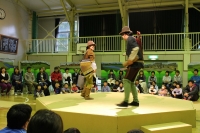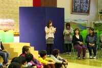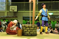 最後に、研修委員会による親子演劇鑑賞教室を行いました。劇団風の子による「陽気なハンス」は、体育館中央に設置された舞台を中心に、体育館全体を使って演じるという珍しいものでした。また、音楽や効果音は、様々な道具や楽器を使って、その場で演奏するなど、驚きも多い作品でした。子どもたちにとっても分かりやすく、とても愉快な物語でした。