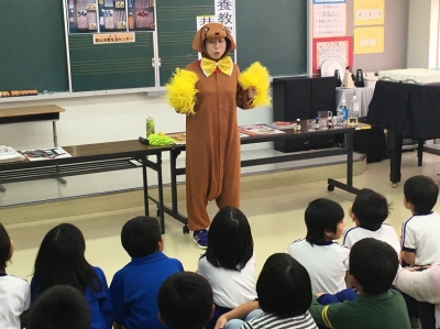 全員で、「わんちゃん!」とお呼びすると、着ぐるみを着た井上先生が登場。驚きの登場に、子どもたちは始まってすぐに井上ワールドに引き込まれていました。