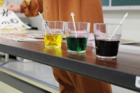炭酸水にジュースなどで使われているブドウ糖果糖液糖を加える実験。みんなで試飲したところ、甘ったるく、おいしいとは言い難い飲み物に。ところが、そこへクエン酸、着色料、香味料を加えると、レモンソーダやメロンソーダ、コーラに変身。子どもたちは、いつもおいしく飲んでいるジュースが、ちょっとこわいもの感じたようです。