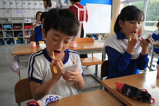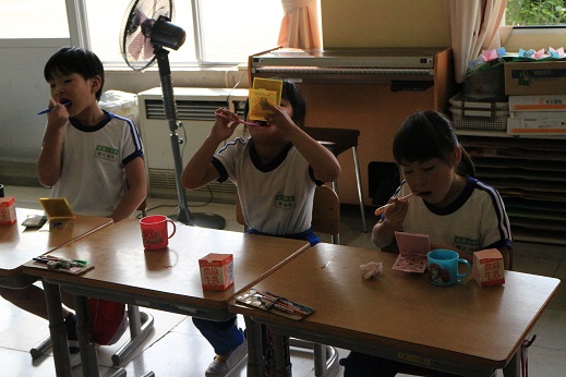 1~2年生に「朝のはみがきをして来なかった人」と聞くと、正直に8人中4人が手を挙げてくれました。「夜はみがいたかな?」の質問に対して、みがいていないと手を挙げる児童が・・・・。