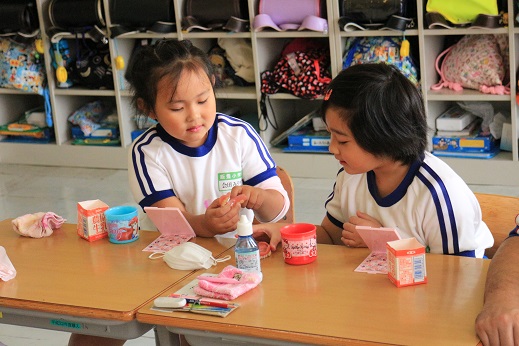 3~4年は乳歯から永久歯への生え変わりの時期です。6歳臼歯(大人の歯)についても教えていただきながら、生えていることを自分の目で手で確認してから赤染めをして歯をみがく学習をしました。