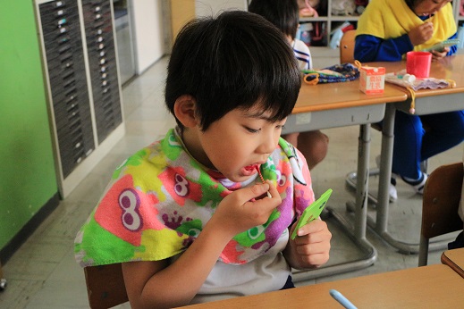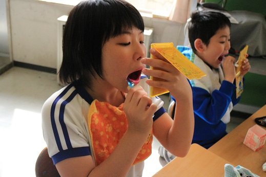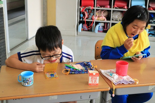 伊藤先生から「歯は、生きている間は一生つかうよ。」「みぞのところをしっかりみがくよ。」「はぶらしの先をつかうよ。」とていねいに教えていただきながら時間をかけてみがいていました。