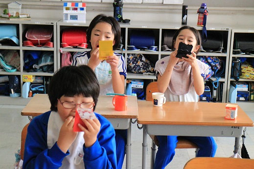 3~4年生に、朝の歯みがき状況と夕べの歯みがき状況を聞いたところ、「全員みがいた。」ということでした。伊藤先生も赤染する前は「楽しみだわ~」と言っていたのですが、いざ、実習してみると、全員の児童の口の中は、「すべて真っ赤っか」で、ちょっとがっかりしていました。
