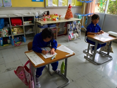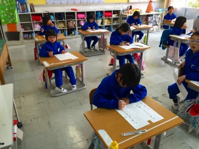 1・2年生は、硬筆(フェルトペン)に挑戦します。お手本を見ながら、一文字一文字ていねいに書くことを心がけました。