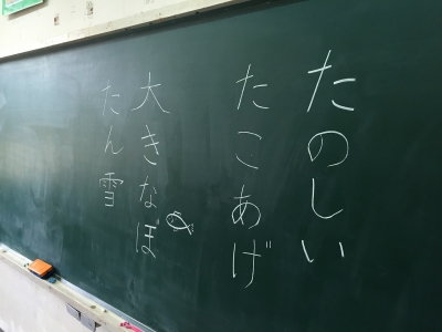 下の黒板の写真にはお魚がいますね。宗像さんに「お魚さんを書くようにすると上手に書けるよ」と教えていただきました。