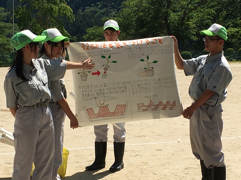 小野高校生は、今回植える花の特徴や植え方、注意することなどを模造紙にまとめてくれていました。とても分かりやすく、子どもたちはしっかり話を聞くことができました。