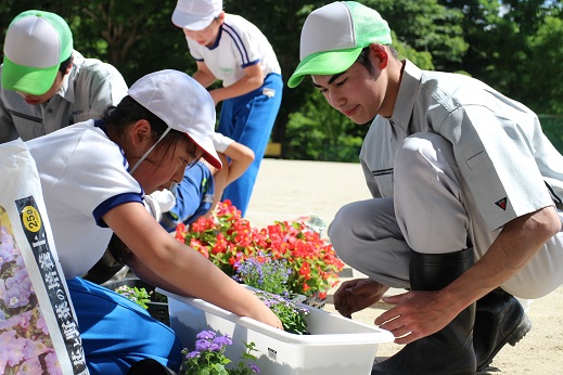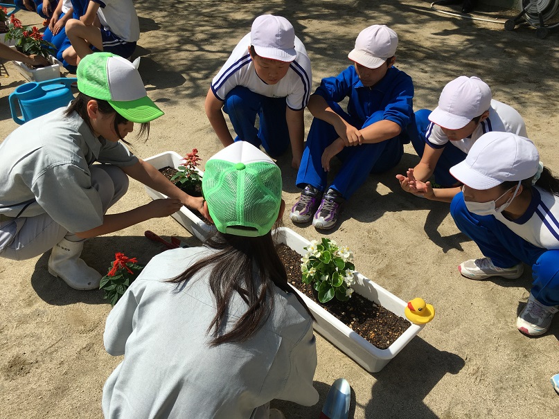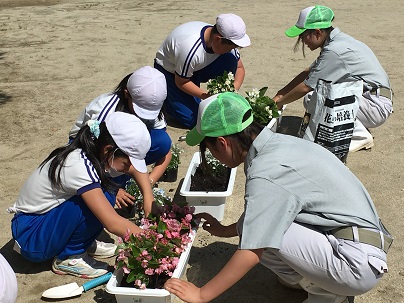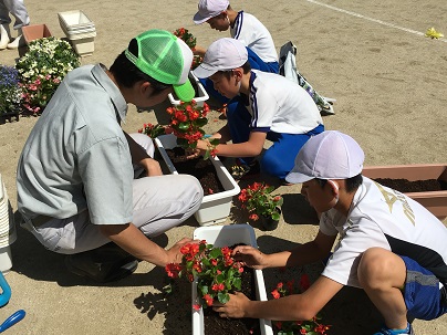 2016年6月10日 19時05分 5・6年生は、小野高校草花班の3年生6名から、花を植えるときのポイントや世話の仕方について教わりながら、花の苗植えを行いました。